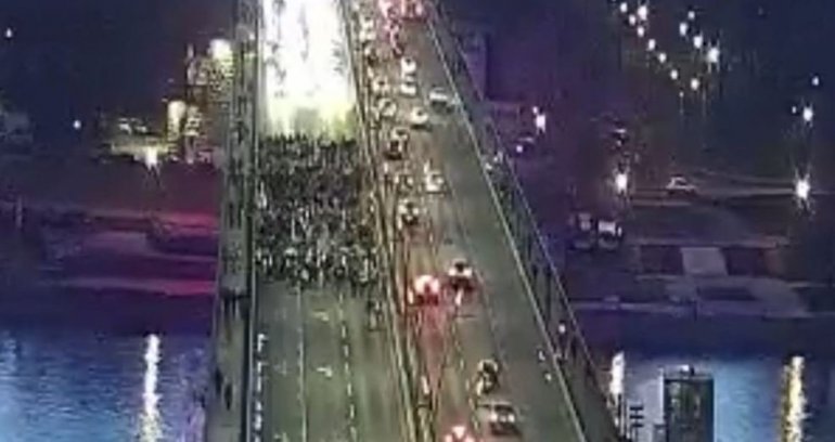 На фотографији која је настала пре почетка блокадерског протеста, види се да само групица блокадера прелази мост ка центру града са Новог Београда и из Земуна.