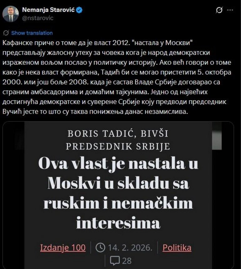 МИНИСТАР за европске интеграције Немања Старовић одговорио је на друштвеној мрежи Икс Борису Тадићу.