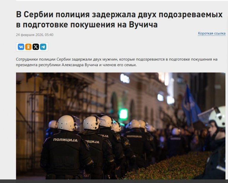 ХАПШЕЊЕ двојице осумњичених због планирања убиства председника Србије Александра Вучића ударна је вест у руским медијима.
