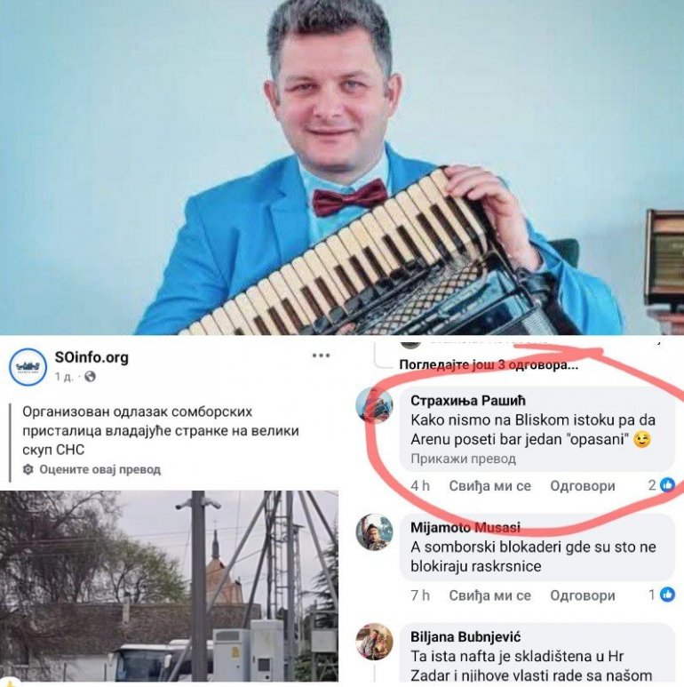 Блокадер Страхиња Рашић из Сомбора, у свом коментару на једној од објава, "молио је" Бога да терористи дођу у Арену и убију председника Србије и све окупљење грађане.
