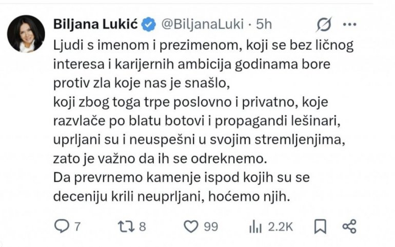 Новинарка блокадерка Биљане Лукић, потврдила је то својом новом објавом.