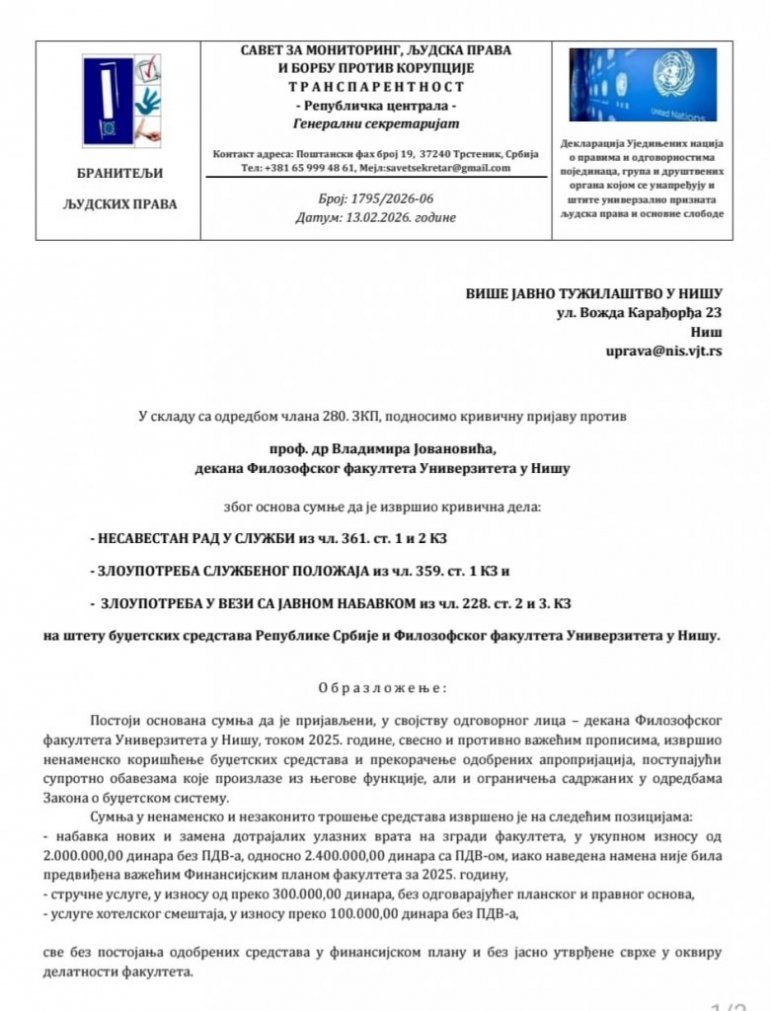 САВЕТ за мониторинг, људска права и борбу против корупције „Транспарентност“ поднео је кривичну пријаву против Владимира Јовановића, декана Филозофског факултета у Нишу, због сумње да је током 2025. године новац из буџета факултета трошио незаконито, ненаменски и мимо свих прописа, преносе медији.