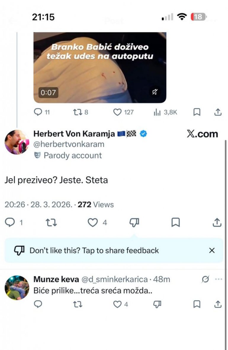 Док се лекари боре за опоравак повређеног Бабића, део јавности апелује на смиреност и минимум достојанства, уз поруку да трагедије никада не смеју бити повод за подсмех или ликовање.