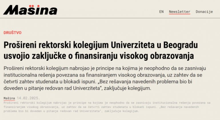 Скандалозан мејл послат је медијима у Србији око поноћи са мејл адресе ПР-а ректората у Београду у име проширеног ректорског колегијума, који чине ректор, проректори, генерални секретар и сви декани факултета, а у којем су изнесене невероватне конструкције и практично српски медији оптужени за све оно што су тајкунске пропагандне тровачнице и Универзитет радили годину и по дана.