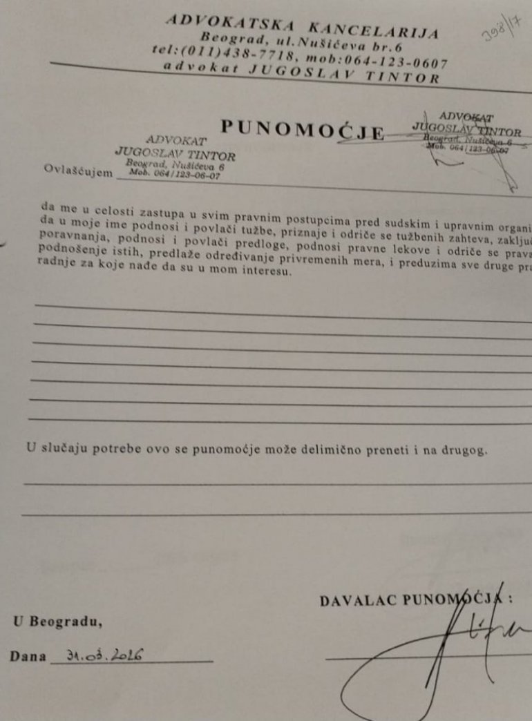 Како сазнајемо од добро обавештеног извора, Тинтор, као и адвокати Небојша Мараш и Дејан Радуновић ангажовани су као пуномоћници Владана Ђокића, само његовим потписом (нашкрабаним у фрци), без његове функције и без печата Универзитета.