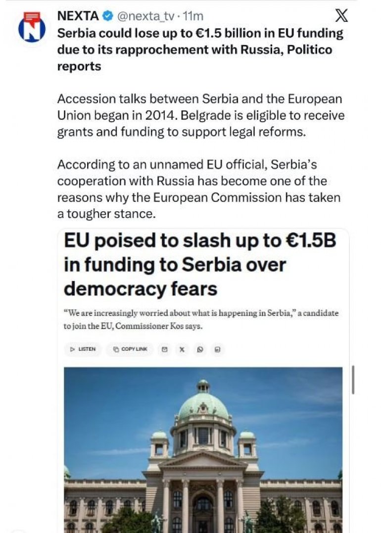 Политико извештава да би Србија могла да изгуби до 1,5 милијарди евра средстава ЕУ због приближавања Русији.