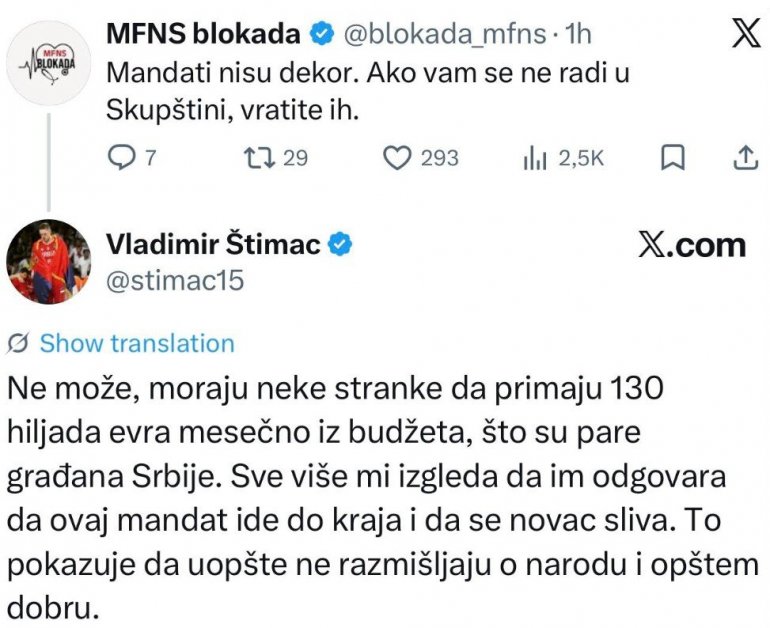 БЛОКАДЕРИ су се огласили на друштвеним мрежама након што је данашња седница Скупштине Србије пркеинута јер није било кворума. По свему сидећи нису задовољни поступцима опозиције. У клинч се укључио и Владимир Штимац.