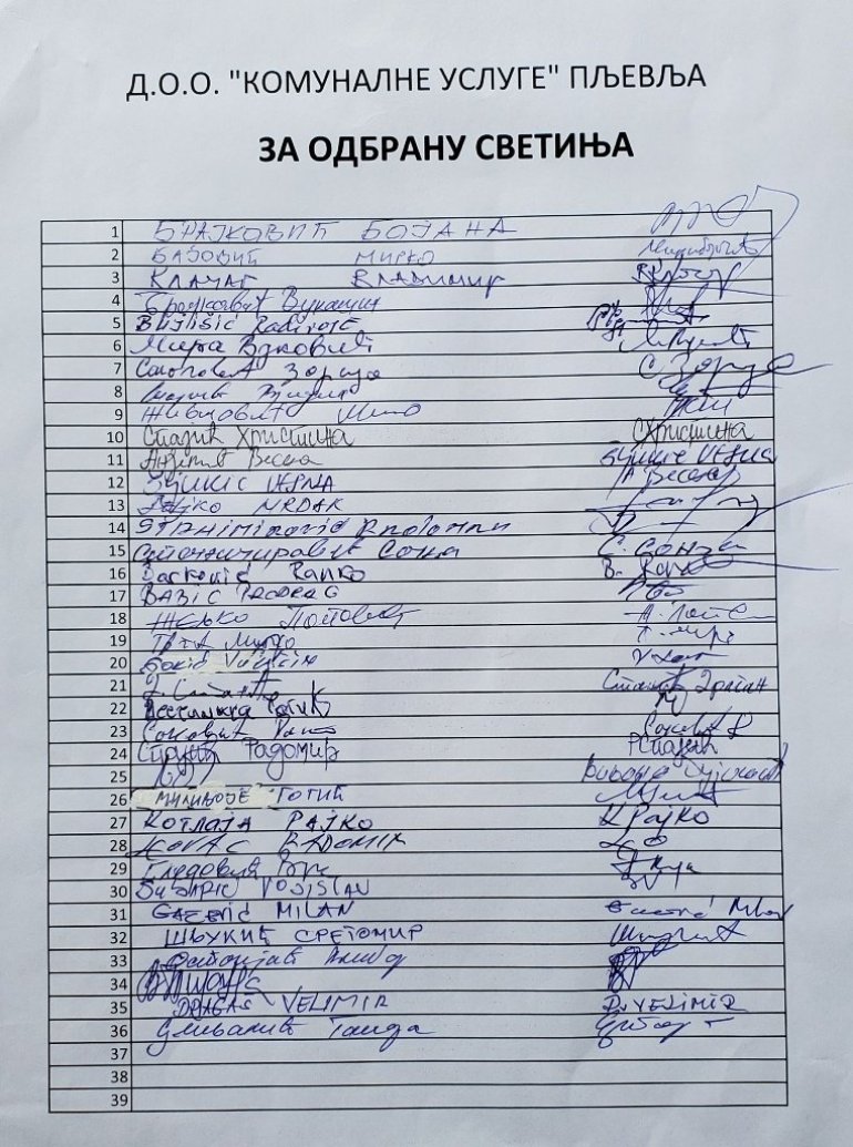 ZAPOSLENI u preduzeću „Komunalne usluge“, čiji je osnivač pljevaljska lokalna uprava, odlučili su i svojim potpisima potvrdili svoju beskompromisnu podršku Srpskoj pravoslavnoj crkvi u odbrani svetinja.