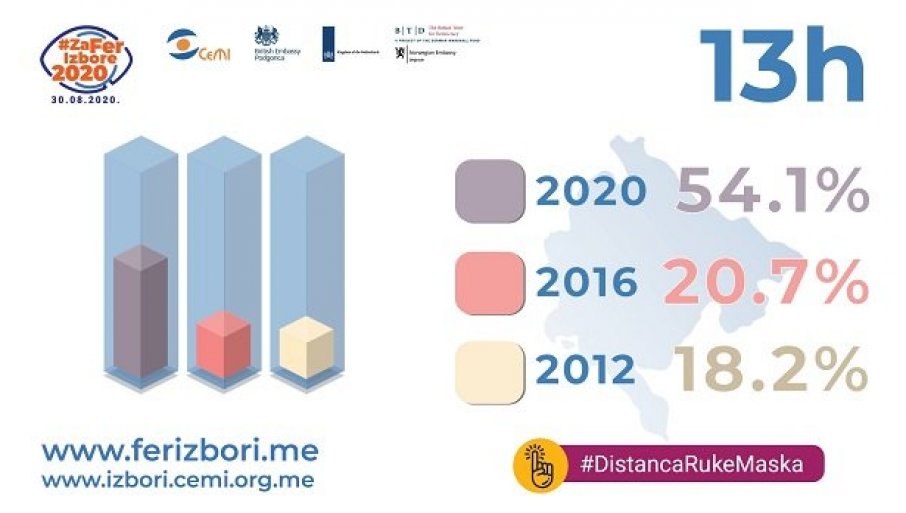 NA svom Tviter profilu CeMI su objavili izlaznost na izbore u Crnoj Gori 2020. godine i uporedili ih sa izlaznošću na parlamentarne izbore 2016. i 2012. godine.