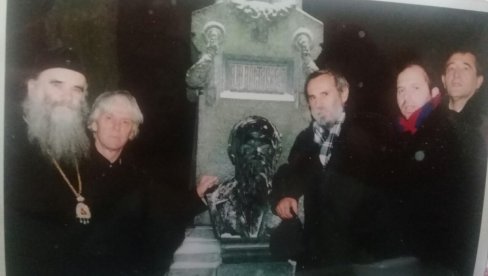 Na grobu Dostojevskog: Amfilohije, Ranko Jovović, Milutin Mićović, Andrija Radulović, Radmilo Marojević / Foto Dokumentacija "Novosti" i "Borba"