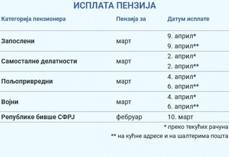 Penzije će 4. i 6. aprila primiti penzioneri iz kategorije poljoprivredni i vojni. Njima će novac 4. aprila leći na tekuće račune, do će 6. aprila isplata penzija biti na kućne adrese i na šalterima pošta.