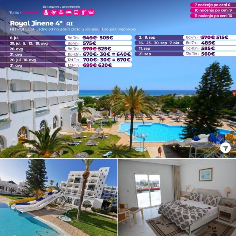 Isključivo sa AirSerbia u Tunis! 7 noćenja po ceni 6 noćenja / 10 noćenja po ceni 9 noćenja / 11 noćenja po ceni 10 noćenja. Izdvajamo iz ponude najtraženije hotele za leto 2023: