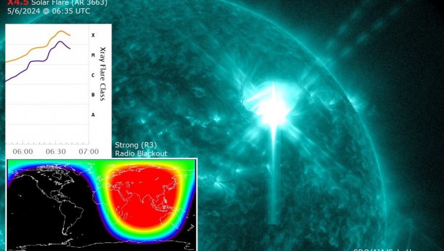 Snažna erupcija na Suncu zabeležena je 6. maja 2024. godine u 6.40 UTC (po svetskom vremenu) ili po našem vremenu 8.40 časova. Erupcija je ocenjena kao X4.5 i to je treća po jačini erupcija u 25 ciklusu Sunčeve aktivnosti, saopštila je Stručno-istraživačka jedinca (SIJ) za praćenje Sunčeve aktivnosti, klimatskih promena i svetlosnog zagađenja Astronomske opservatorije u Beogradu.