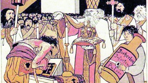 „Srpsko kraljevsko krunisanje obavljeno praškom za insekte“ ( koji drži đakon u desnom uglu), Foto Dokumentacija “Novosti”, “Borbe” i "Vikipedija"