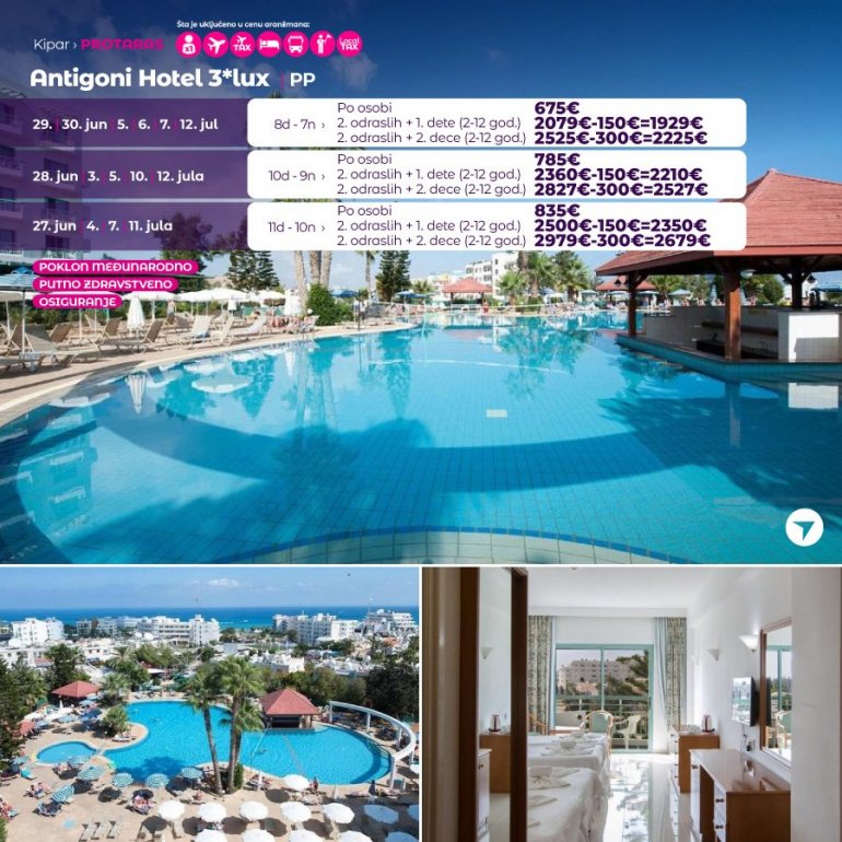 Hotel Antigoni nalazi se u Protarasu, na 900 metara od plaže Sanrajz (Sunrise). Na raspolaganju su veliki bazen nepravilnog oblika, fitnes sala, teniski teren, restoran sa uslugom na bazi švedskog stola i 3 bara.