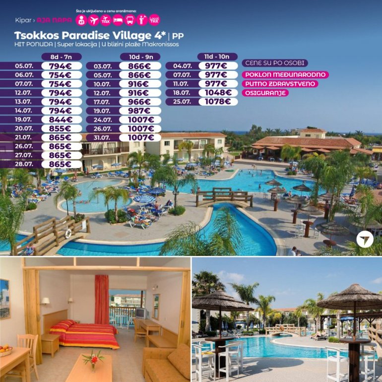 Ovo odmaralište sa 4 zvezdice nalazi se u letovalištu Aja Napa. Nudi zatvoreni bazen, fitnes centar, saunu i otvoreni bazen nepravilnog oblika, okružen nameštenom terasom za sunčanje. Sadržaji odmarališta Tsokkos Paradise takođe obuhvataju restoran-bar pored bazena, igraonicu sa bilijarom, teniski teren i mini-market.