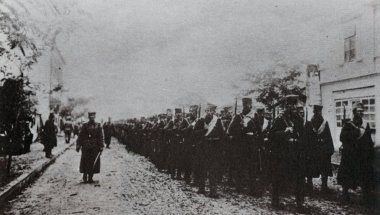 - Bio je lep, sunčan dan. Nove kaplarske zvezdice i bajoneti sijali su na suncu. Dušanov most je treperio pod čvrstim koracima đaka kaplara. Iz publike, čuli su se prigušeni jecaji i plač i reči: "Odoše đaci na front, odoše đaci u smrt". Buketi cveća padali su na nas, na kaldrmu - poneo je slike u sećanju Tadija Pejović.