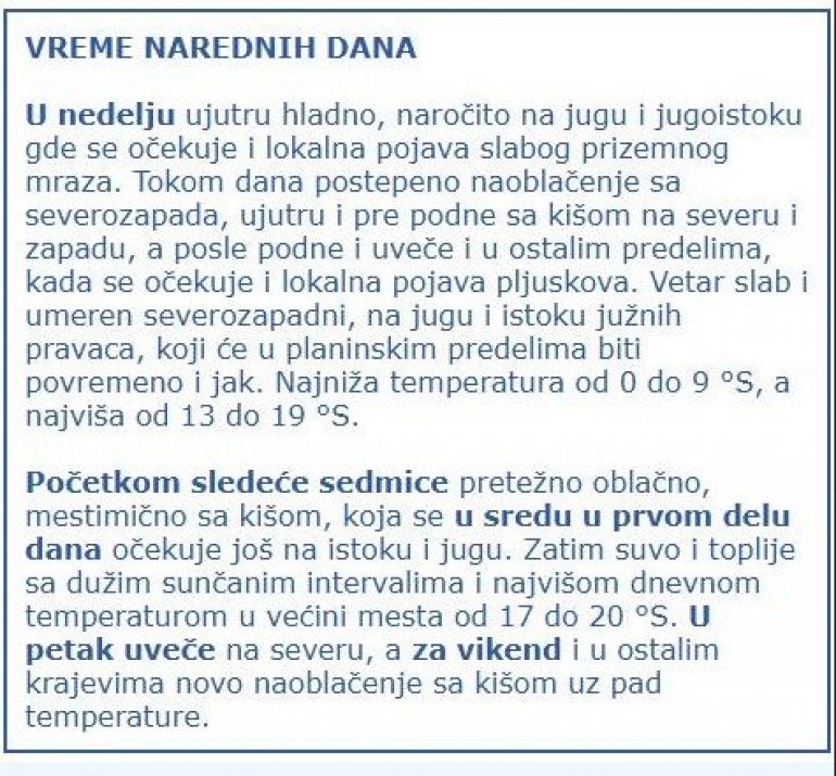 - U nedelju ujutru hladno, naročito na jugu i jugoistoku gde se očekuje i lokalna pojava slabog prizemnog mraza. Tokom dana postepeno naoblačenje sa severozapada, ujutru i pre podne sa kišom na severu i zapadu, a posle podne i uveče i u ostalim predelima, kada se očekuje i lokalna pojava pljuskova. Vetar slab i umeren severozapadni, na jugu i istoku južnih pravaca, koji će u planinskim predelima biti povremeno i jak. Najniža temperatura od 0 do 9, a najviša od 13 do 19 stepeni.