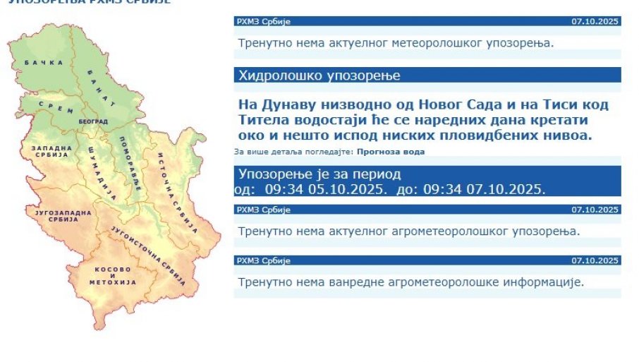 U istočnoj i jugoistočnoj Srbiji danas je na snazi žuti meteo alarm zbog kiše. Ovo upozorenje znači da vreme može biti potencijalno opasno: Vremenske pojave koje su prognozirane nisu neuobičajene, ali je potreban oprez ako planirate aktivnosti koje su izložene meteorološkom riziku. Treba nastaviti sa informisanjem o očekivanim meteorološkim uslovima. Ne preduzimajte nepotrebne rizike.