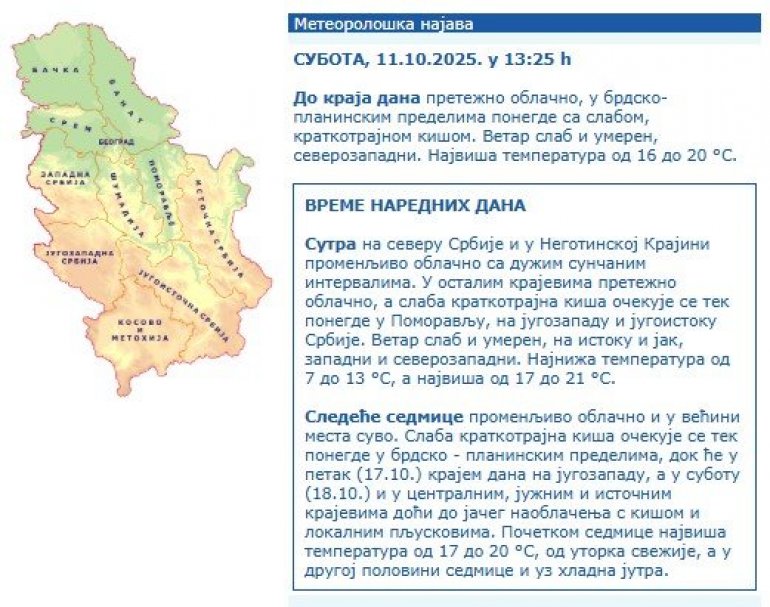 Sledeće sedmice promenljivo oblačno i u većini mesta suvo. Slaba kratkotrajna kiša očekuje se tek ponegde u brdsko - planinskim predelima, dok će u petak (17.10.) krajem dana na jugozapadu, a u subotu (18.10.) i u centralnim, južnim i istočnim krajevima doći do jačeg naoblačenja s kišom i lokalnim pljuskovima. Početkom sedmice najviša temperatura od 17 do 20 °S, od utorka svežije, a u drugoj polovini sedmice i uz hladna jutra. - stoji na sajtu RHMZ.
