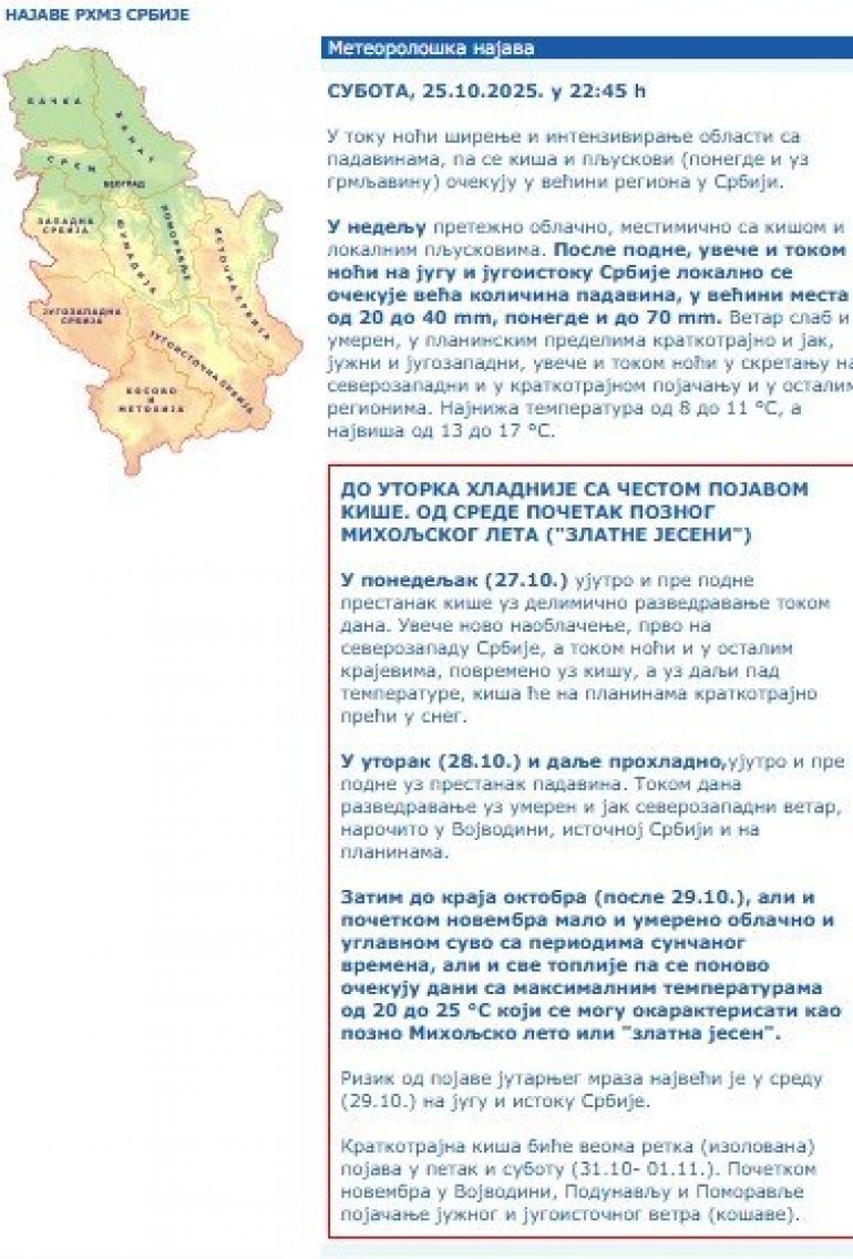 U ponedeljak (27.10.) ujutro i pre podne prestanak kiše uz delimično razvedravanje tokom dana. Uveče novo naoblačenje, prvo na severozapadu Srbije, a tokom noći i u ostalim krajevima, povremeno uz kišu, a uz dalji pad temperature, kiša će na planinama kratkotrajno preći u sneg.