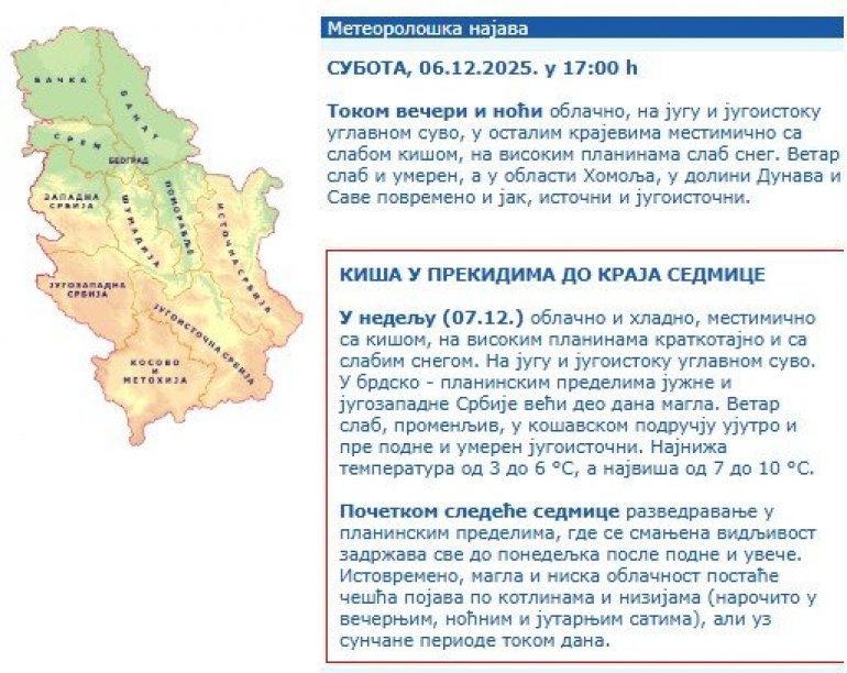 U nedelju (07.12.) oblačno i hladno, mestimično sa kišom, na visokim planinama kratkotajno i sa slabim snegom. Na jugu i jugoistoku uglavnom suvo. U brdsko - planinskim predelima južne i jugozapadne Srbije veći deo dana magla. Vetar slab, promenljiv, u košavskom području ujutro i pre podne i umeren jugoistočni. Najniža temperatura od 3 do 6 °S, a najviša od 7 do 10 °S.