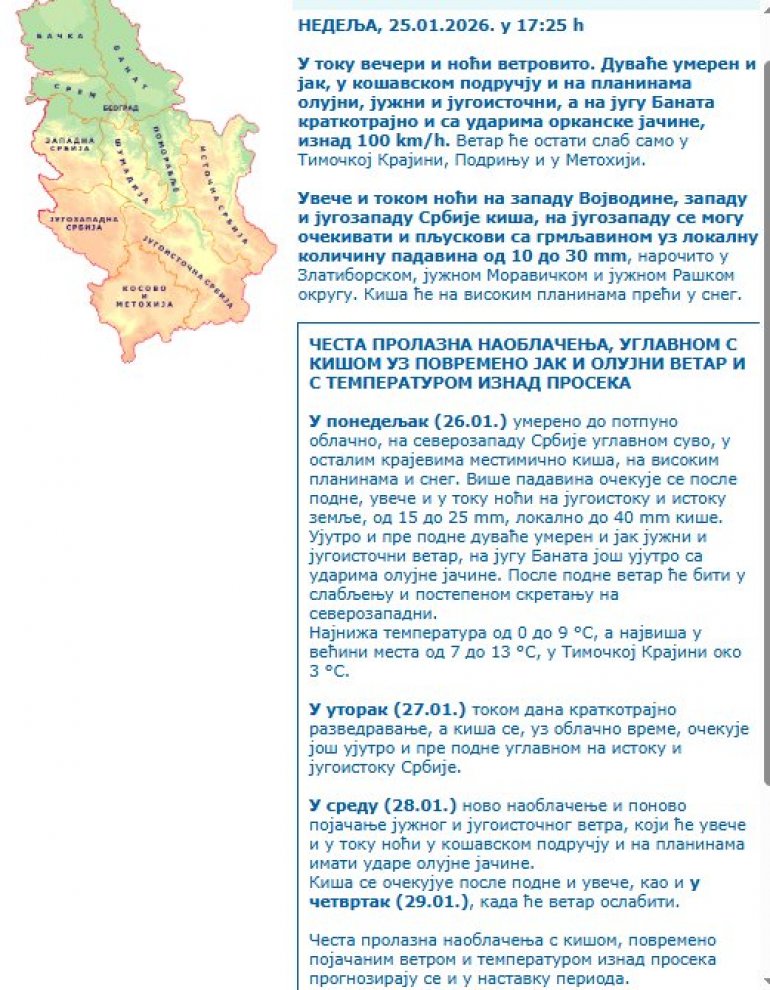 U ponedeljak (26.01.) umereno do potpuno oblačno, na severozapadu Srbije uglavnom suvo, u ostalim krajevima mestimično kiša, na visokim planinama i sneg. Više padavina očekuje se posle podne, uveče i u toku noći na jugoistoku i istoku zemlje, od 15 do 25 mm, lokalno do 40 mm kiše.