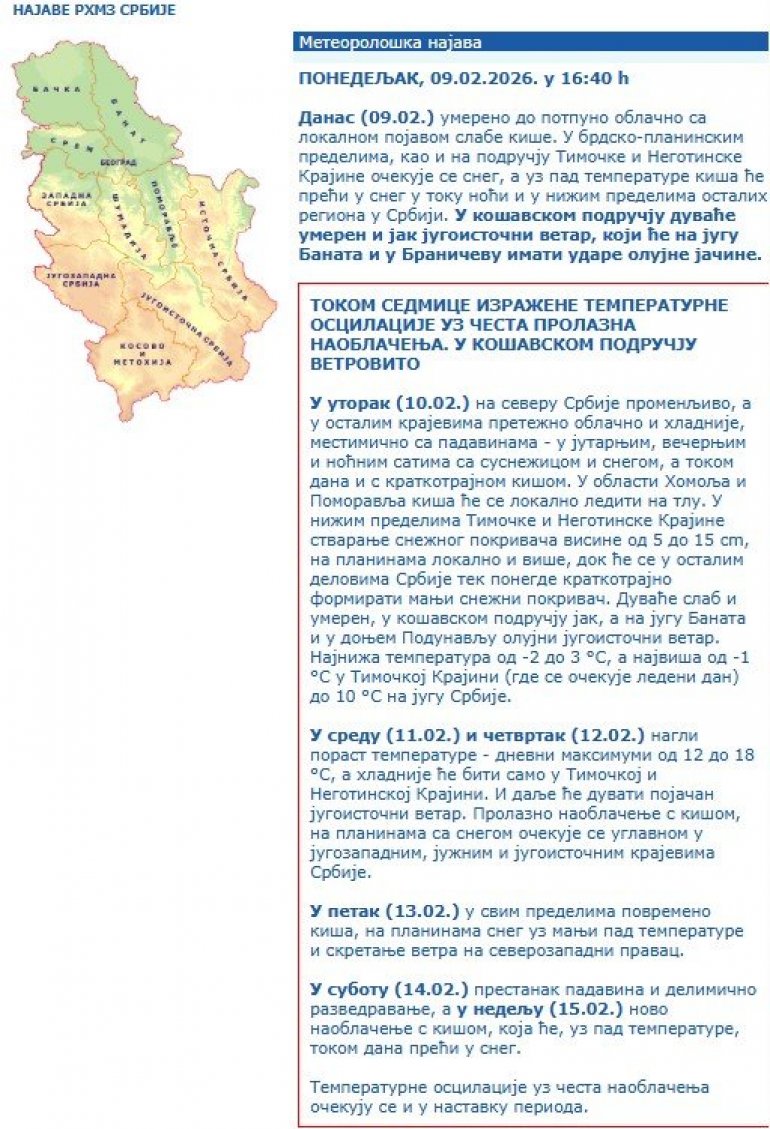- Danas (09.02.) umereno do potpuno oblačno sa lokalnom pojavom slabe kiše. U brdsko-planinskim predelima, kao i na području Timočke i Negotinske Krajine očekuje se sneg, a uz pad temperature kiša će preći u sneg u toku noći i u nižim predelima ostalih regiona u Srbiji. U košavskom području duvaće umeren i jak jugoistočni vetar, koji će na jugu Banata i u Braničevu imati udare olujne jačine.