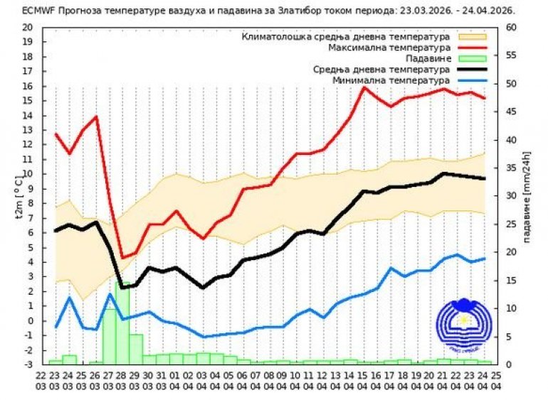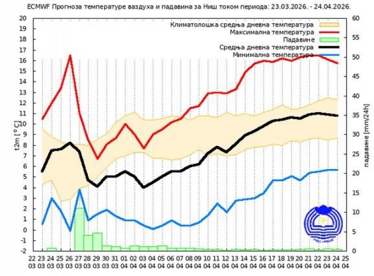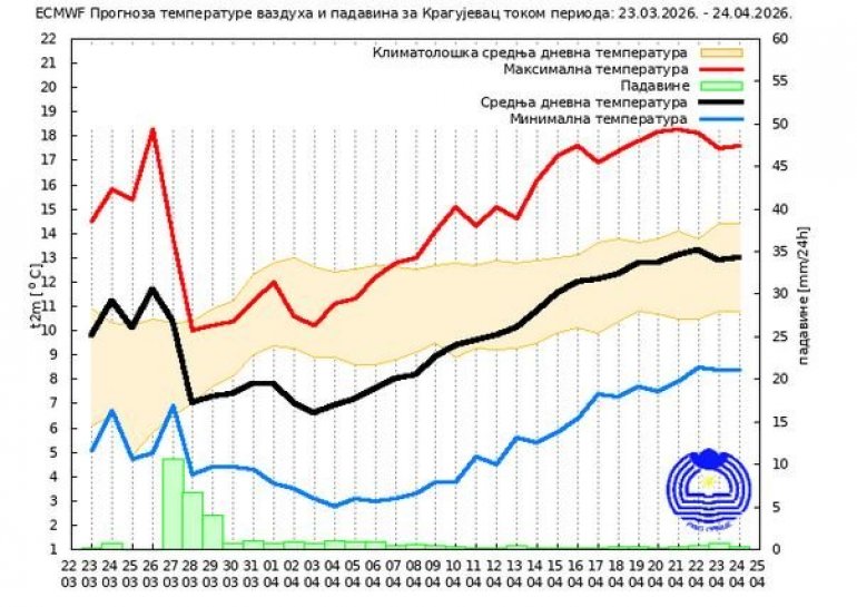 Prema sezonskoj prognozi RHMZ-a, srednja minimalna temperatura vazduha u aprilu biće iznad višegodišnjeg proseka, pri čemu će njena vrednost biti viša za 0.5ºS do 1.0ºS u odnosu na višegodišnji prosek. U Beogradu i široj okolini predviđa se vrednost aprilske srednje minimalne temperature vazduha oko 10.0ºS. Srednja maksimalna temperatura vazduha u aprilu biće iznad višegodišnjeg proseka, sa vrednostima, koje će u celoj Srbiji biti za 0.5ºS do 1.0ºS više u odnosu na višegodišnji prosek. U Beogradu i široj okolini srednja maksimalna temperatura vazduha tokom aprila biće oko 18.9ºS. Mesečna suma padavina tokom aprila zadržavaće se u granicama višegodišnjeg proseka sa vrednostima za 5 mm do 10 mm višim u odnosu na višegodišnji prosek. U Beogradu i široj okolini aprilska suma padavina iznosiće oko 58 mm.