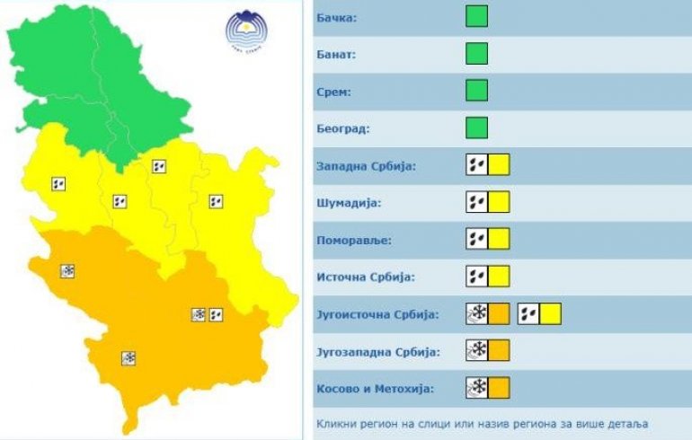 Prema prognozi, u većini krajeva očekuje se oblačno vreme sa kišom i kratkotrajnim pljuskovima, dok će u planinskim predelima padati sneg uz dalje povećanje snežnog pokrivača. Lokalno su moguće i jače padavine, posebno u istočnoj, severnoj i zapadnoj Srbiji tokom večeri.