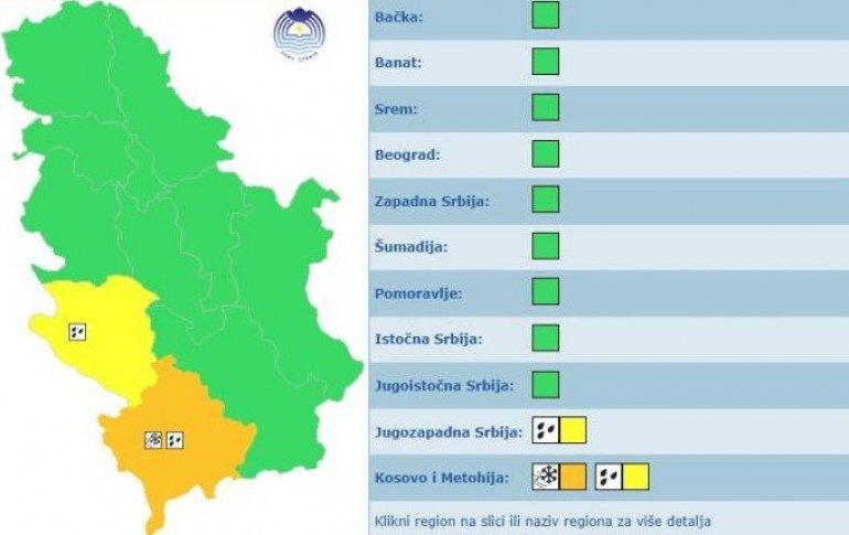 Zbog snega i leda, kao i obilne kiše biće na snazi narandžasti meteo alarm na Kosovu i Metohiji, a na jugozapadu žuti.