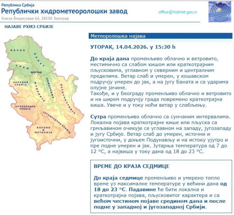 Prema prognozi, do kraja dana biće promenljivo oblačno i vetrovito, uz povremenu slabu kišu ili kratkotrajne pljuskove, uglavnom u severnim i centralnim krajevima zemlje. U košavskom području duva umeren do jak vetar, dok se na jugu Banata očekuju i udari olujne jačine.