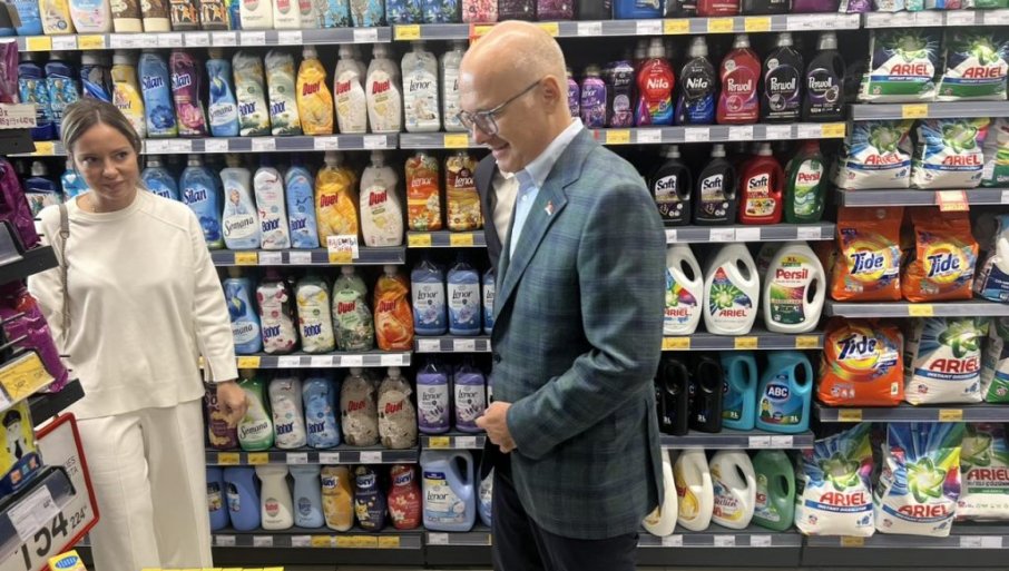 PREMIJER Srbije Miloš Vučević obilazi market kod Pirota, kako bi se uverio da li je sve u redu sa akcijom "Najbolja cena."