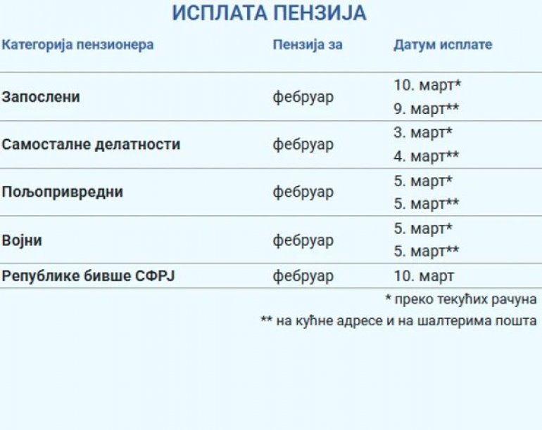 Do sada su penzije isplaćene penzionerima iz kategorije poljoprivredni, vojni i iz kategorije samostalne delatnosti njima je novac isplaćen 4. i 5. marta.