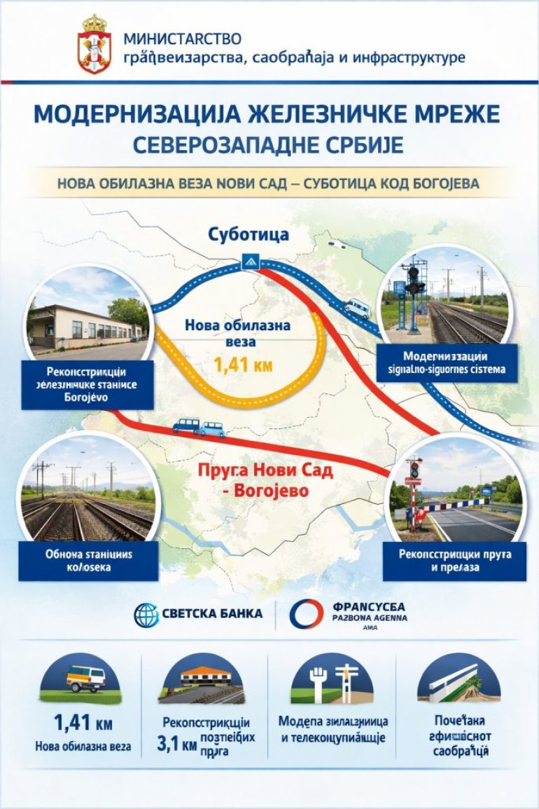 MINISTARSTVO građevinarstva, saobraćaja i infrastrukture pokrenulo je ranu fazu tržišnog angažovanja za infrastrukturni projekat modernizacije železničke mreže u severozapadnoj Srbiji, koji obuhvata izgradnju nove veze između pruge Subotica-Bogojevo-državna granica i pruge Novi Sad-Odžaci-Bogojevo, uz rekonstrukciju železničke stanice Bogojevo.