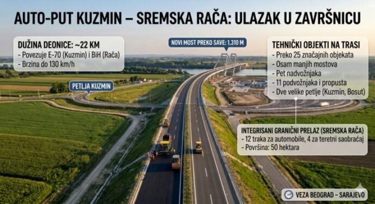 Deonica Kuzmin-Sremska Rača direktno se nadovezuje na most preko Save i prelazi u deonicu Rača-Bijeljina, prvu etapu strateškog projekta izgradnje auto-puta Beograd-Banja Luka.