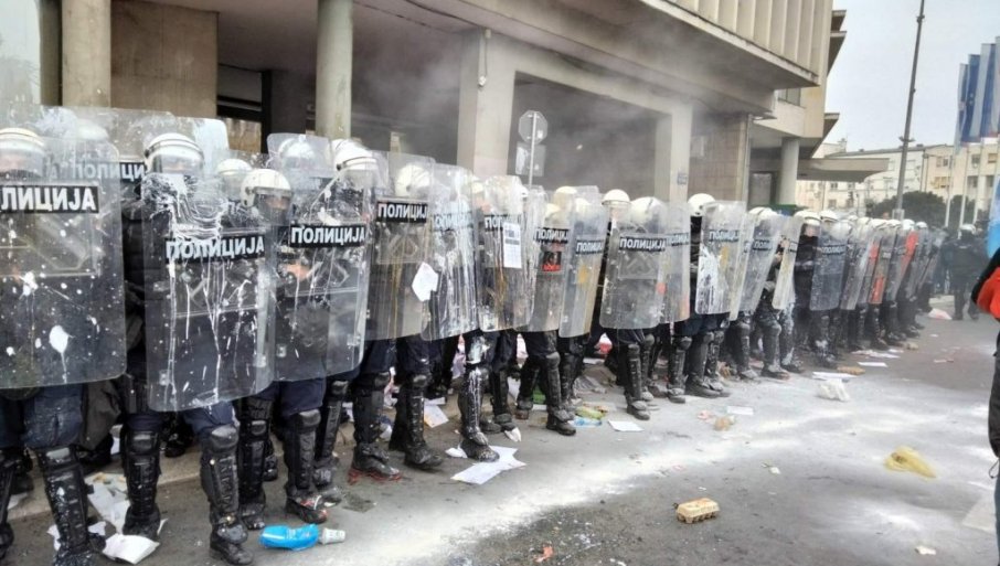 Tokom okupljanja ispred Skupštine grada, povređeno je pet policijskih službenika, od kojih je jednom polomljena kost šake.