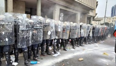 Sumnja se da su, tokom neprijavljenog javnog skupa ispred Skupštine grada, oni gađali jajima, farbom i drugim predmetima kordon policije koji je obezbeđivao zasedanje.