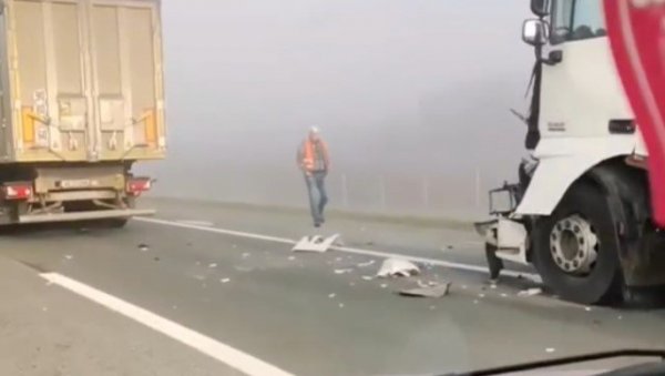 Kako se na snimku, koji je objavio 192.rs, može videti, delovi šlepera rasuti su po putu, a magla dodatno otežava situaciju.
