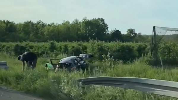 Kako se vidi, automobil je probio zaštitnu ogradu, te je sleteo na travnatu površinu pored puta.