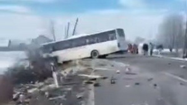 Autobus je skliznuo u jarak pored puta, a kamion je u uništen.