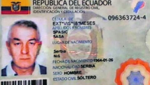 SPASIĆ je imao ličnu kartu Ekvadora i prebivalište u toj državi, a poslednji put je u tu zelju ušao u martu i imao je vizu na 18 meseci. Nišlija se navodno bavio trgovinom lekovima i medicinskom opremom, a sumnja se da se osim ovog posla, bavio i švercom droge, iako ga nema u evidenciji tamošnje policije.