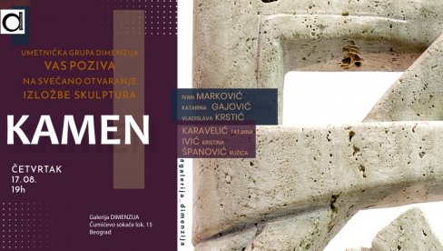 ŠESTORO autora, različitih likovnih poetika, čije je uverenje da izrada skulpture u kamenu zahteva celokupno biće stvaraoca- biološko i umno, iziskujući značajan fizički napor i naročit mentalni angažman, rabeći jednako i duh i telo- predstaviće se zajednički na izožbi u galeriji "Dimenzija" (Čumićevo sokače 15).