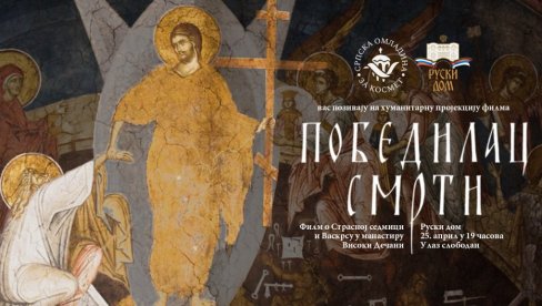 DOKUMENTARNI film "Pobedilac smrti" snimljen je u manastiru Visoki Dečani na Kosovu i Metohiji,a govori o danima poslednje sedmice u Vaskršnjem postu koja je još poznata kao Strasna ili Stradalna, kao i o Vaskrsenju Isusa Hrista. Humanitarna projekcija biće održana na inicijativu dobrotvorne organizacije "Srpska omladina za Kosmet", u četvrtak, 25. aprila, u Ruskom domu u Beogradu.