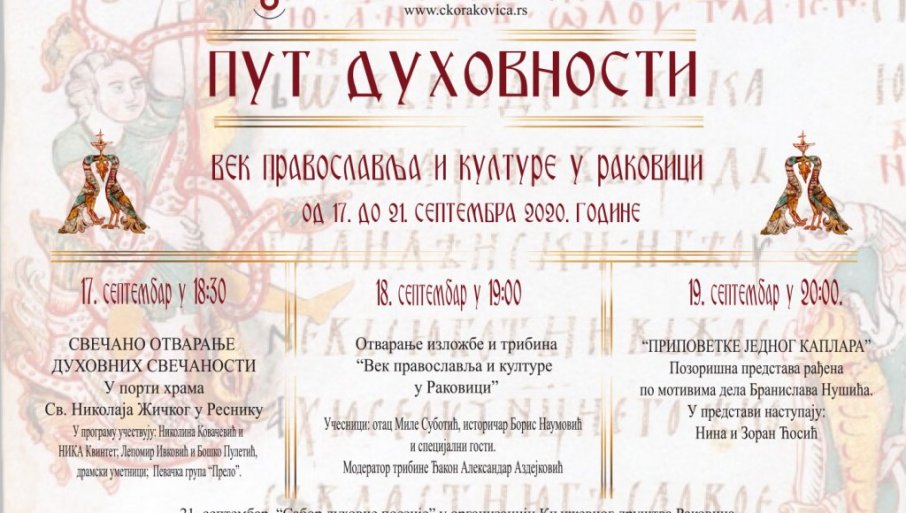 PETE Duhovne svečanosti "Put duhovnosti"( u organizaciji Centra za kulturu i obrazovanje Rakovica) počinju 17.septembra, u porti hrama Sv. Vladike Niklaja Žičkog: prve večeri nastupiće Nikolina Kovačević uz pratnju NIKA kvinteta, dramski umetnici Lepomir Ivković i Boško Puletić, koji će odigrati odlomke iz predstave "Vreme časti i ponosa", a planiran je i koncert anasambla „ Dimitrije Koturović“.