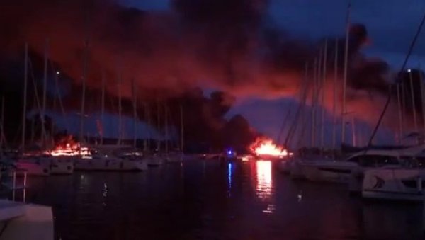 U 21.40 LOKALIZOVAN je veliki požar u marini u Kaštel Gomilici u Hrvatskoj. Prema prvim informacijama izgorelo je pet brodova, a povređenih nema.