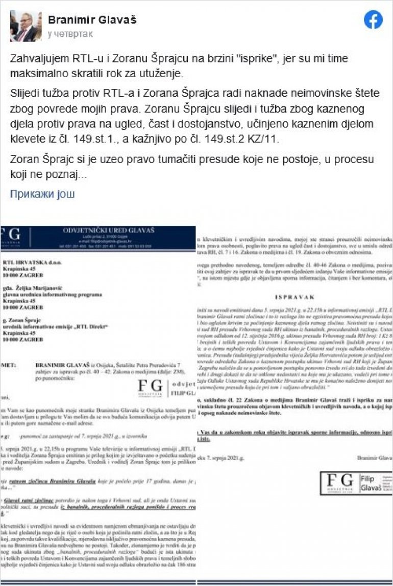 Glavaš je na svom fejsbuk nalogu odmah napisao da će i pored izvinjenja tužiti Šprajca, a njegovi pratioci su počeli da vređaju, ponižavaju i prete likvidaciojom novinaru, usput “istražujući” genezu njegovog imena, optužujući ga da je bio Srbin koji je promenio prezime...