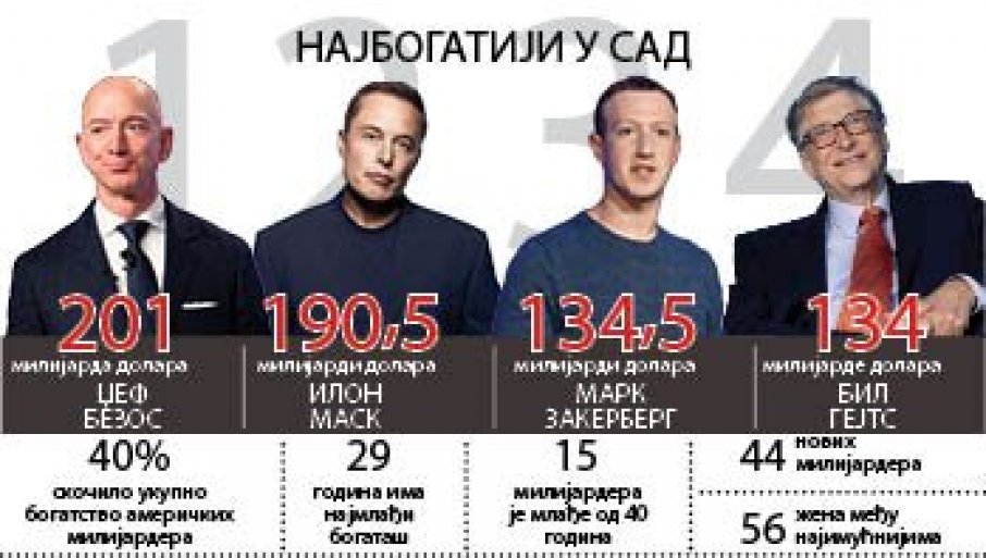 Očigledno, ni korona, ni njene posledice po ekonomiju država, nisu omele najbogatije Amerikance da imetak uvećaju tokom protekle godine. Ukupno bogatstvo 400 najbogatijih u SAD skočilo je za godinu dana čak 40 procenata, na 4.500 milijardi dolara! Prvih 20 na listi zajedno vrede zapanjujućih 1.800 milijardi dolara, navodi "Forbs".