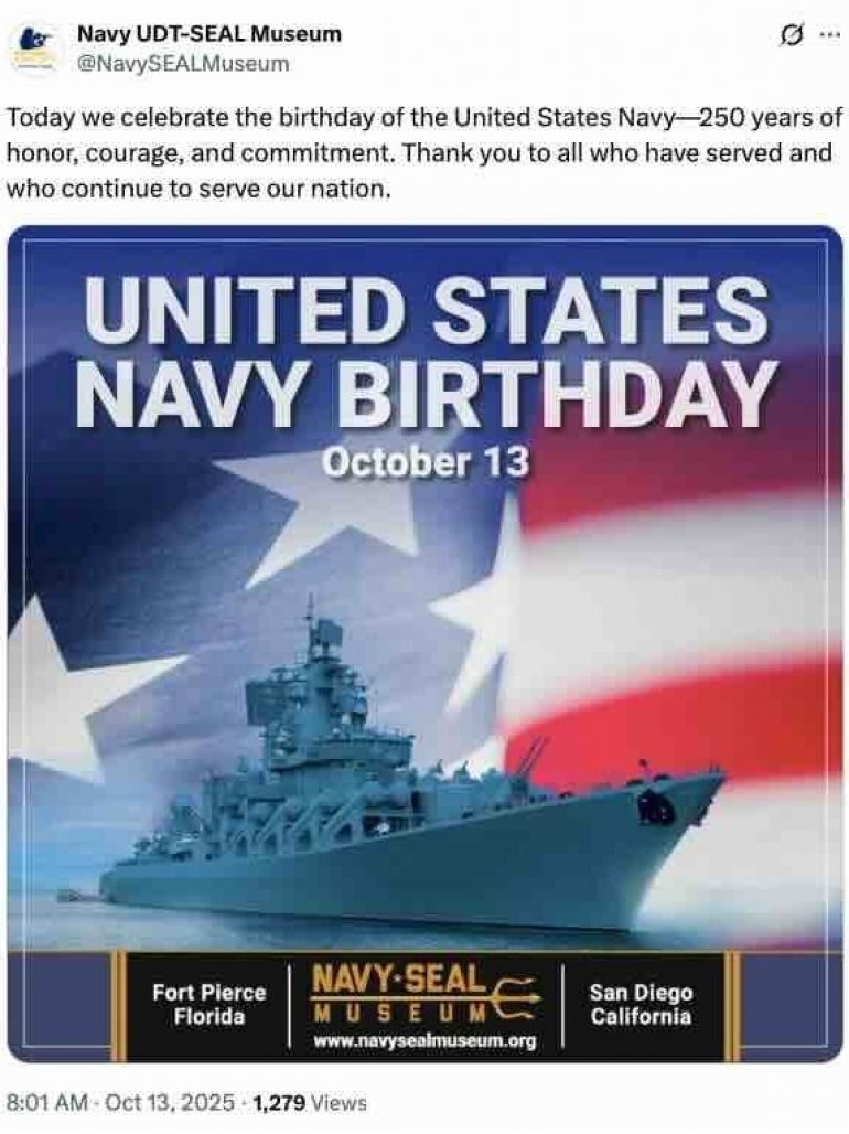 NACIONALNI muzej mornarice UDT-SEAL u Fort Pirsu (Florida) objavio je na društvenoj mreži X čestitku povodom 250 godina američke mornarice — uz fotografiju ruske raketne krstarice Varjag (projekat 1164 „Atlant“, NATO kodnog imena Slava-klasa).