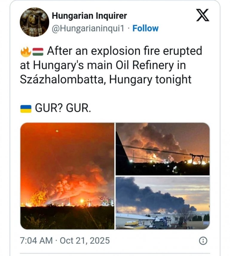 - Nakon eksplozije, večeras je izbio požar u glavnoj mađarskoj rafineriji nafte u Sažalombati, u Mađarskoj. GUR? GUR - navodi se u objavi na mreži X.